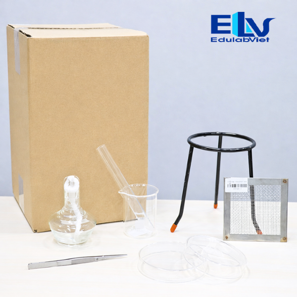 Bộ thí nghiệm được thiết kế với các dụng cụ thủy tinh và inox chịu nhiệt, đảm bảo an toàn khi thực hiện các bước đun nóng, xử lý mẫu và quan sát kết quả thí nghiệm trong phòng học hoặc phòng thí nghiệm.