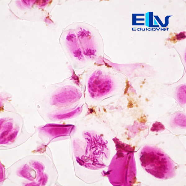 Tiêu bản được nhuộm màu rõ nét, màu sắc đậm giúp dễ dàng quan sát các cấu trúc tế bào và nhiễm sắc thể dưới kính hiển vi. Mẫu vật được gắn lam phủ để bảo vệ cấu trúc tế bào, giúp tiêu bản có độ bền cao trong quá trình sử dụng. Nếu được bảo quản đúng cách, tiêu bản có thể sử dụng trong nhiều năm và phù hợp cho việc giảng dạy, thực hành trong phòng thí nghiệm.