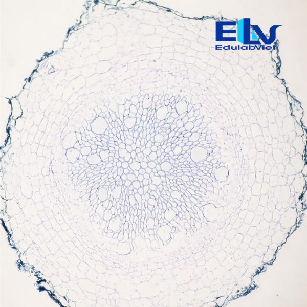 Tiêu bản rễ húng chanh được nhuộm màu rõ nét giúp các cấu trúc tế bào hiển thị rõ ràng khi quan sát dưới kính hiển vi. Mẫu tiêu bản đã được gắn lam phủ chắc chắn, giúp bảo vệ mẫu khỏi tác động của môi trường và tăng độ bền trong quá trình sử dụng.