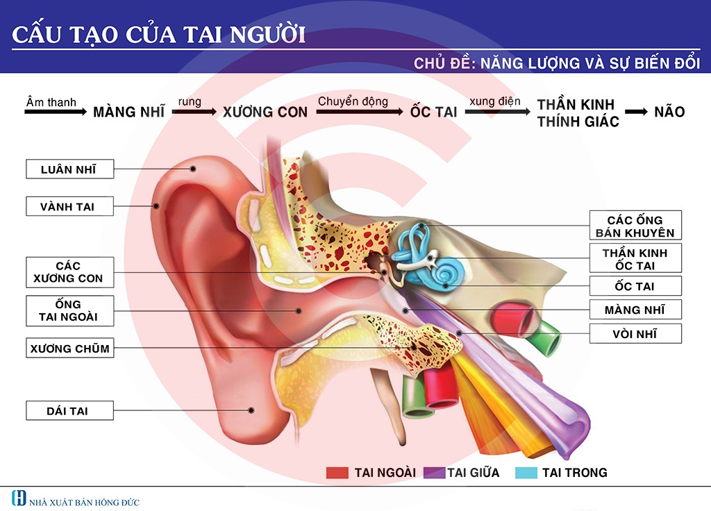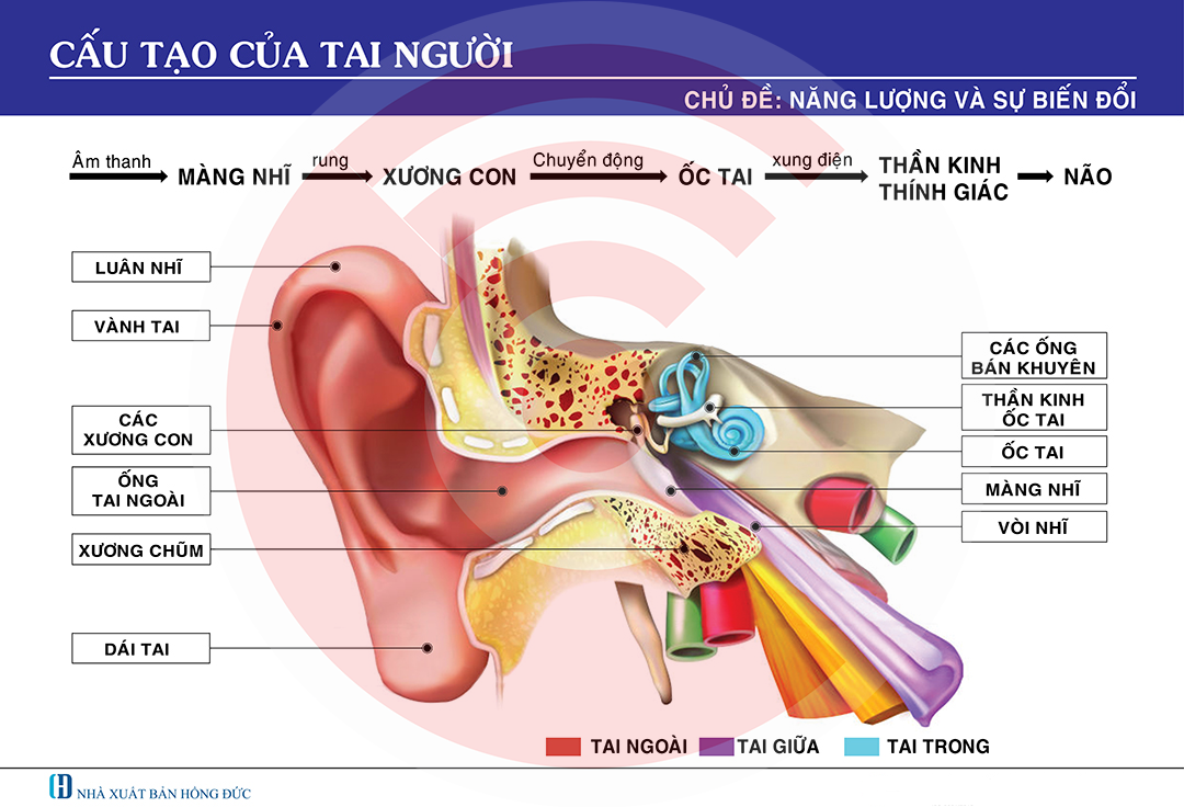 Tranh sơ đồ cấu tạo tai người là công cụ giảng dạy trực quan, giúp người học hiểu rõ các bộ phận của tai và quá trình thu nhận âm thanh, góp phần nâng cao hiệu quả học tập và giảng dạy.
